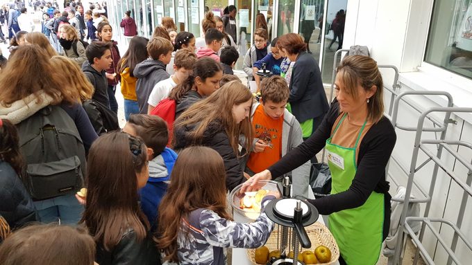 Lors des récréations de certains jours, les élèves se voient ainsi proposer dans la cour des fruits ou des légumes à déguster, sous forme de jus, de smoothies, de petits morceaux, de fruits entiers... Aujourd'hui, c'était quartiers de pommes du Tarn-et-Garonne pour tout le monde !